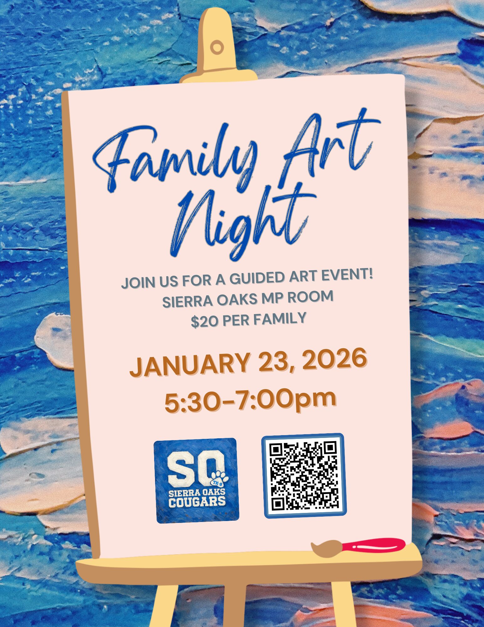 Join us for a family fun guided art night in the Sierra Oaks MP room! Cost to attend is just $20 per family. We can't wait to see you there!